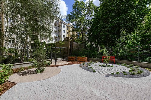 Nadstandardní vybavení domu zahrnuje recepci, která poskytuje profesionální služby a zajišťuje bezpečnost objektu, saunu pro chvíle relaxace a krásně upravený vnitroblok se zahradou. Tento klidný venkovní prostor nabízí ideální místo k odpočinku, posezení s přáteli nebo rodinou.